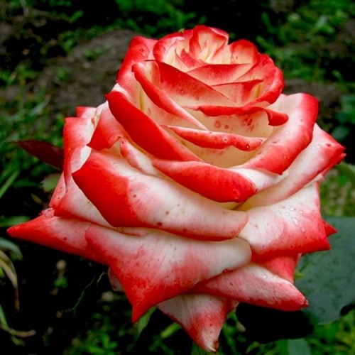 Крупные цветы оригинальной двухцветной окраски, белые, с клубнично-красным краем, со множеством лепестков и сильным ароматом. Сорт великолепно подходит для срезки и выращивания в садовых цветниках.